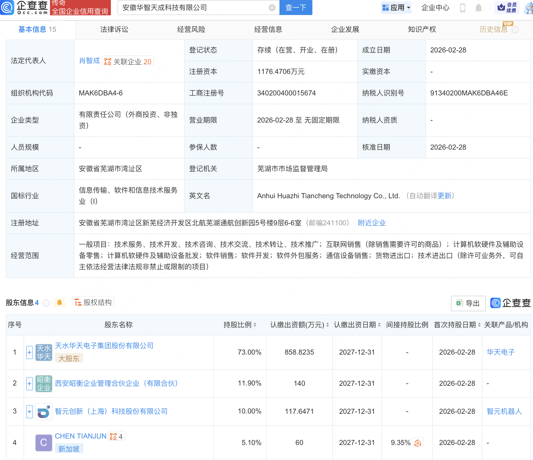 近日,安徽华智天成科技有限公司竖立,米兰体彩app法定代表东谈主为肖智成,盘算边界包含:诡计机软硬件及提拔开采零卖;诡计机软硬件及提拔开采批发;软件销售;通讯开采销售等。企查查股权穿透显现,该公司由智元机器东谈主关联公司智元蜕变(上海)科技股份有限公司、天水华天电子集团股份有限公司等共同握股。