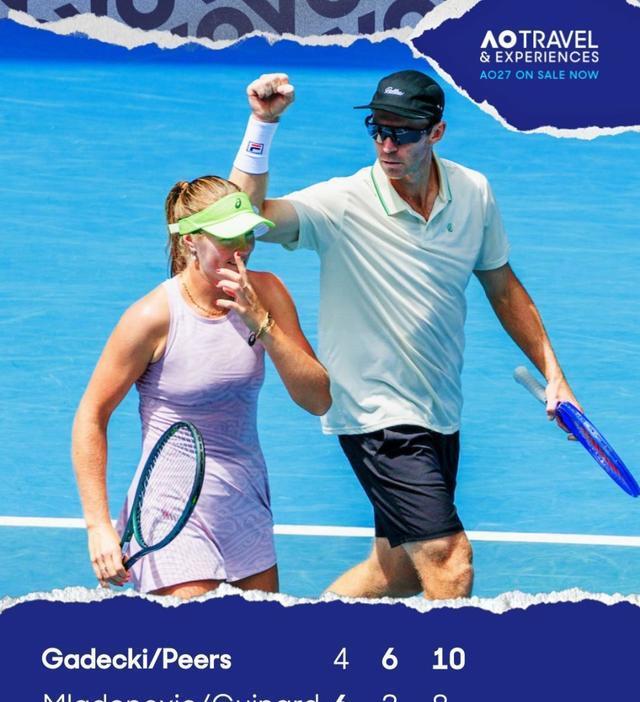 1月30日,澳网混双决赛在罗德拉沃尔球场打响,对阵两边分辩是原土外卡盖德基/皮尔斯和法国组合梅拉德诺维奇/吉纳尔。本场比赛两边战满三盘,盖德基/皮尔斯先丢一盘后实现逆转,2-1打败了梅拉德诺维奇/吉纳尔组合,得胜加冕澳网混双冠军。