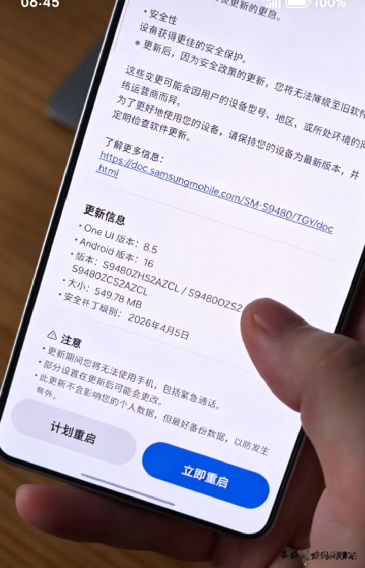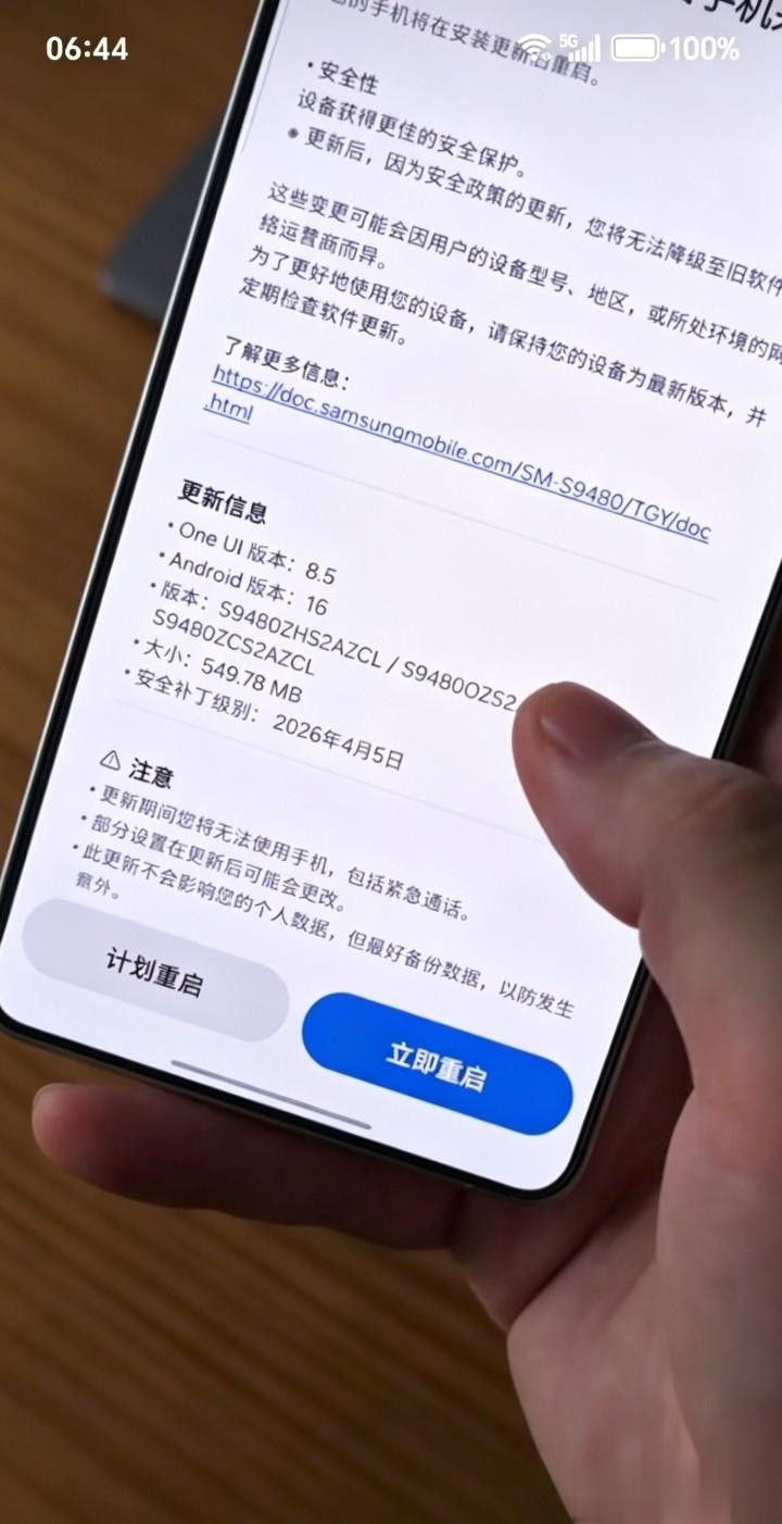 2026年4月5日,三星厚爱向Galaxy S26 Ultra用户推送了One UI 8.5系统更新,版块号为S9480ZHS2AZCL,基于Android 16系统,更新包大小为549.78 MB。这次更新以“安全性、畅达性、省电性”为中枢决策,通过多项底层优化与功能和谐,为用户带来更沉静、更高效的转移体验。