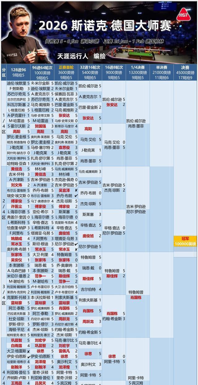 最新即时更新2026斯诺克德国众人赛进度签表,一表看德国众人赛全程,诸位看官憨厚敬请转发保藏,以备经常之须