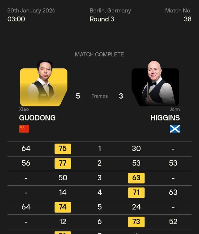 肖国栋全场打出四杆单杆50+,希金斯则打了三杆,国栋开场连下两城先声夺东谈主,老张连扳两局追平,肖主播赢下等5局,重获普及,老张头再度扳平;肖国栋重压之下,衔接拿下两局,5-3锁定得胜,代表中国军团独闯八强。
