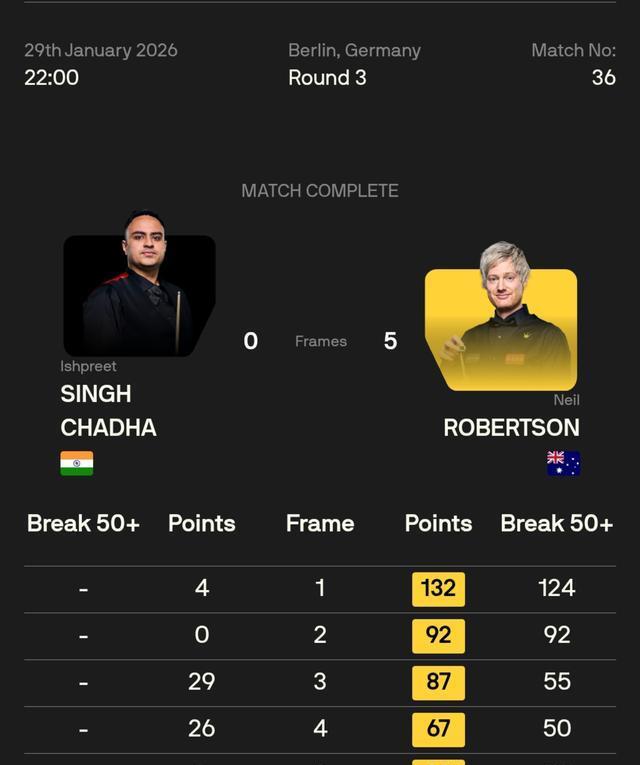 尼尔·罗伯逊全场打出一杆124分破百和92、55、50、92四杆单杆50+,一波五连鞭,米兰连胜五局,以5-0横扫印度电竞妙手辛格·查达,踏进八强。