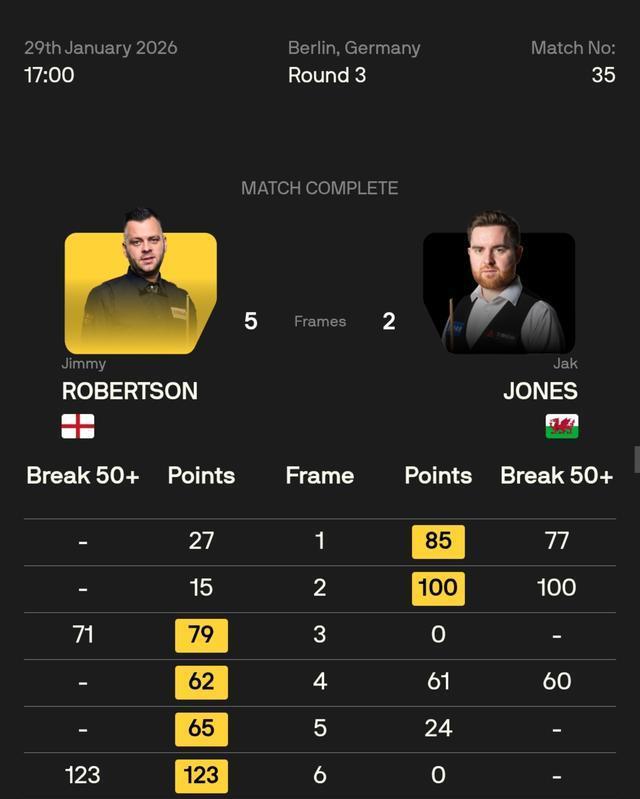 杰克·琼斯打出一杆100分的整破百和77、60、55分三杆50+,先下两城,可惜的后两杆50+,都没能完成单杆致胜,第四局更是遭吉萝卜狂暴的一分清台极限逆转,吉米·罗伯逊打出一杆123分破百和一杆单杆71,一波五连鞭,以5-2逆袭拿下琼斯,闯进八强,下一场迎来久违的罗伯逊德比。