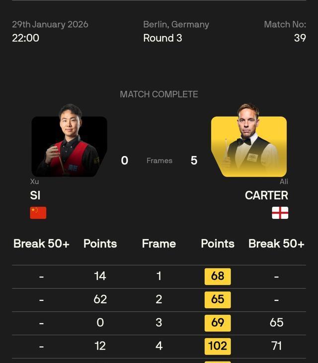 上一轮悠然恩怨,拿下火老翁的阿里·卡特,打出65、71分两杆单杆50+,祭出一轮五连鞭,以5-0横扫刚刚绝杀塞众人的中国球员徐想,杀进八强。