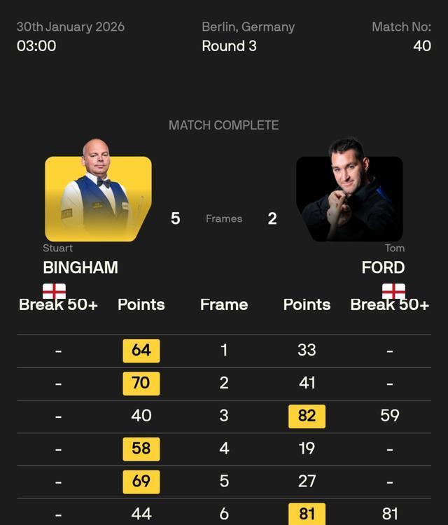 全场比赛,领有九杆147的宾汉姆,确切一杆衔接遑急也莫得打出,靠两波两连击,先后以2-0、4-1普及,汤姆·福德打出59、81分两杆50+,赢下等3、第6局,最终斯图尔特·宾汉姆以5-2驯服汤姆·福德,杀进八强。