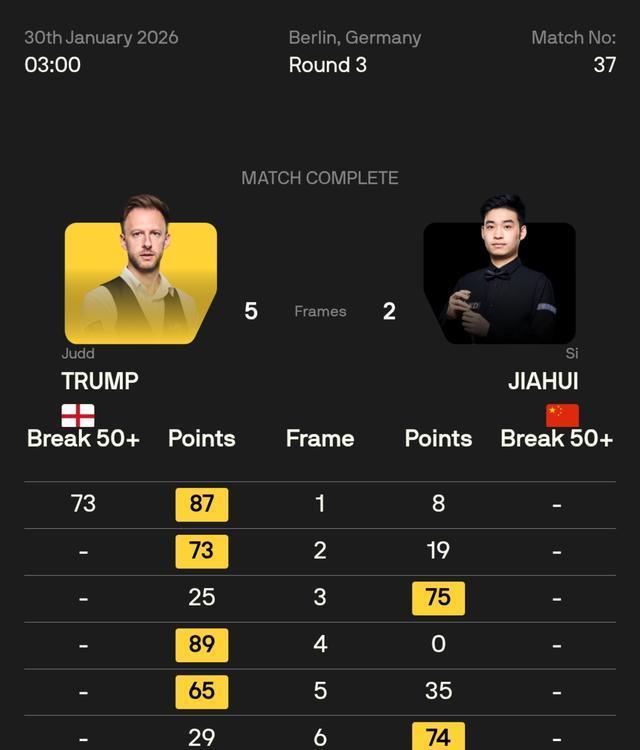 贾德·特鲁姆普本场景象欠安,开场打出两东谈主全场惟一的一杆单杆73分,先下两城,而景象全无的斯佳辉缠斗中拿下等3局,小特又是一波两连击,4-1先达赛点,窸窸窣窣中小斯再追一局,特鲁姆普以5-2驯服斯佳辉,挺进八强。