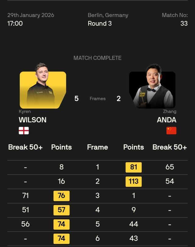 凯伦·威尔逊全场比赛打出71、51、56、95分四杆单杆50+,张安达打出65、54分两杆50+,开杆张安达先下两城,随后威尔逊给与了比赛,米兰一波五连鞭,连胜五局,以5-2驯服张安达,晋级八强。