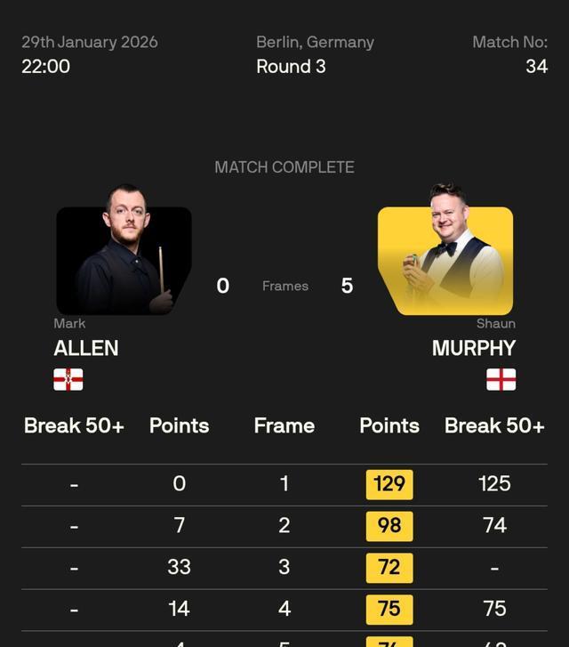 肖恩·墨菲全场打出一杆125分破百和74、75、62分三杆单杆50+,一轮五连击,连胜五局,以5-0横扫马克·艾伦,晋级八强。