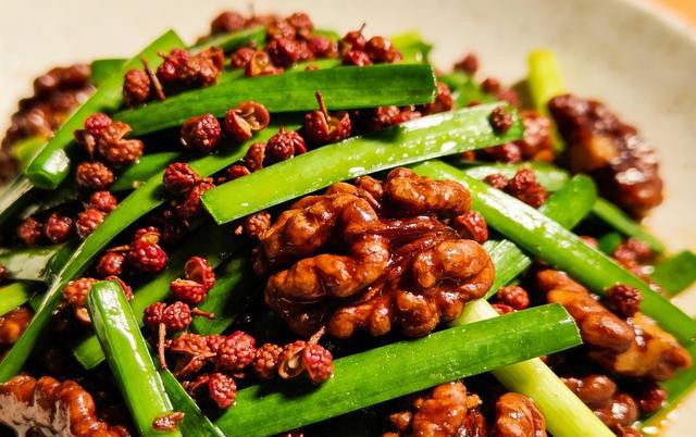 潮湿重的东谈主常伴胃口差,怕冷还肚胀,于是第三招把战场移到炒锅,用辛香的花椒和韭菜作念“武器相逢”的快炒。锅先烧至隐微冒烟,下核桃仁,文火慢翻,名义刚染浅褐坐窝控油备用,这么可保留坚果油脂的甘香。