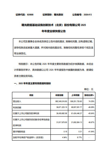 2月25日,朝阳数创(920808)发布2025年年度事迹快报,公司2025年包摄于上市公司推动的净利润同比大幅下滑四成余,盈利端进展劣势。天然公司营收高增74.29%,但事迹不认知、多项盈利观点走弱的态势同步清醒。