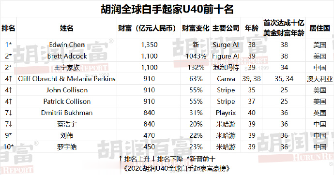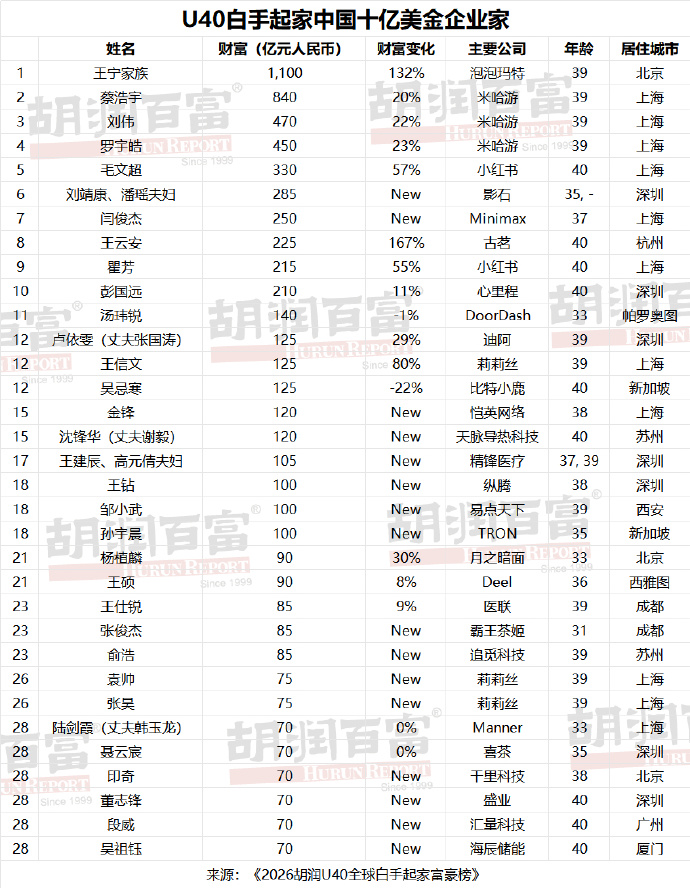 米兰体彩下载 《2026胡润U40民众赤手起家富豪榜》公布: 泡泡玛特王宁眷属以1100亿东说念主民币排第二, AI初度成为第一大创富行业