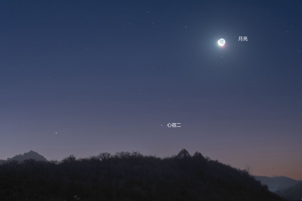 中国天文体会会员、天文科普民众修立鹏先容,4月6日23时30分傍边,心宿二将会和一轮亏凸月一齐从东南边向起飞,跟着期间的推移,7日凌晨4时前后,心宿二与亏凸月完成投合“任务”,此时,它们位于南边夜空。