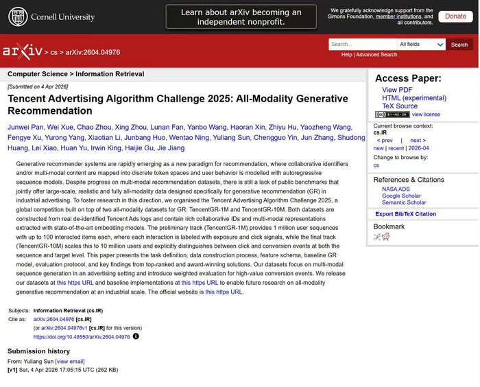 近日,腾讯告白技巧团队晓示开源2025年腾讯告白算法大赛的技巧效果和数据集,其中包括学术论文、千万级别的全模态数据集以及官方基线模子代码,促进生成式保举技巧发展。
