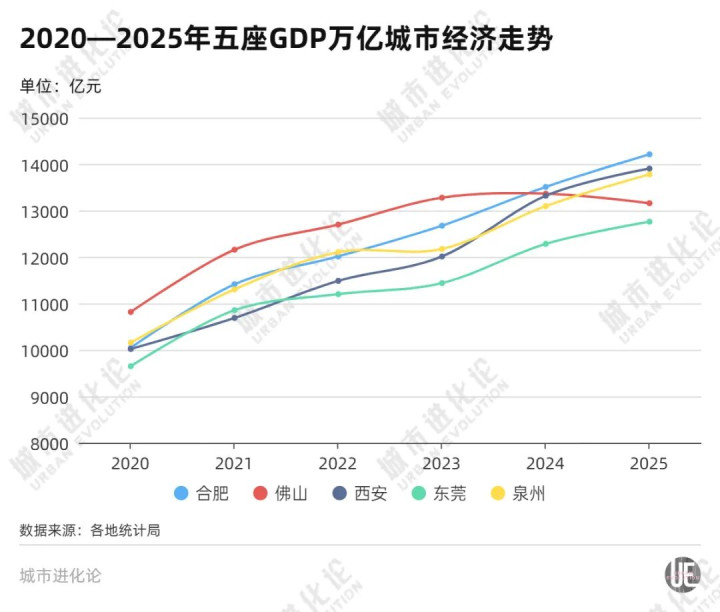 数据夸耀,“十三五”末,佛山GDP体量高于合肥、西安等中西部省会,以及泉州、东莞等东部强市。但到“十四五”末,佛山已被合肥、西安、泉州先后赶超,东莞更是紧追不舍、贴身缠斗。